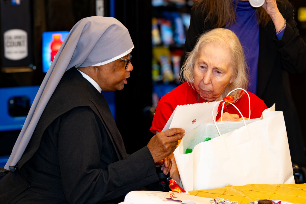Then Mary Lou, a long-time Resident, added, “What grabs me is the delight the Little Sisters get from giving us the gifts. They seem so happy to come around to distribute, as a community, the lovely presents they begged for us!”