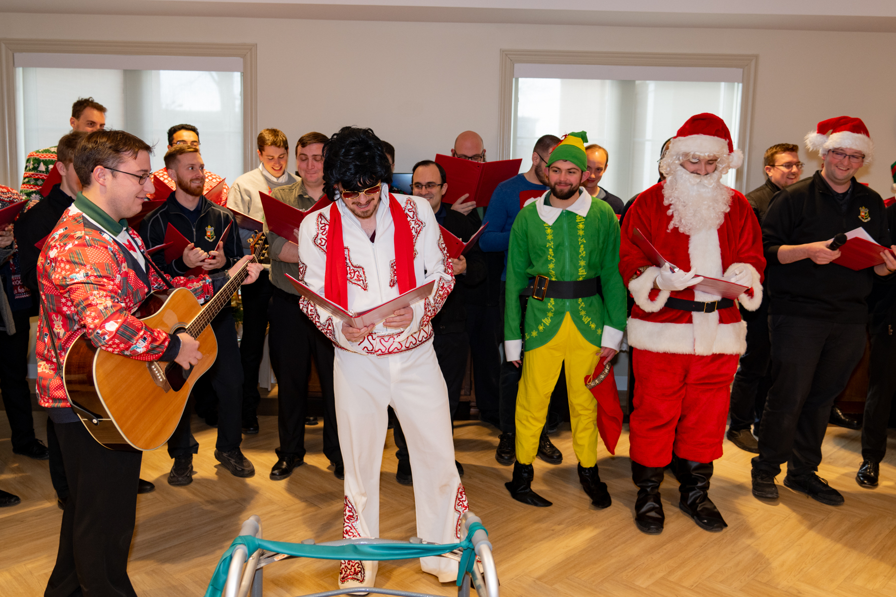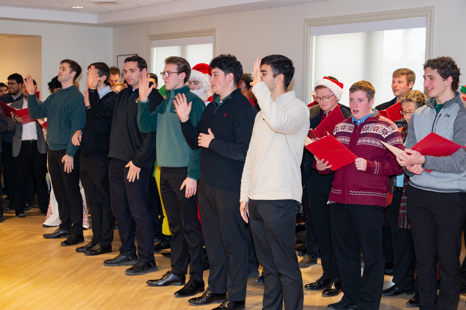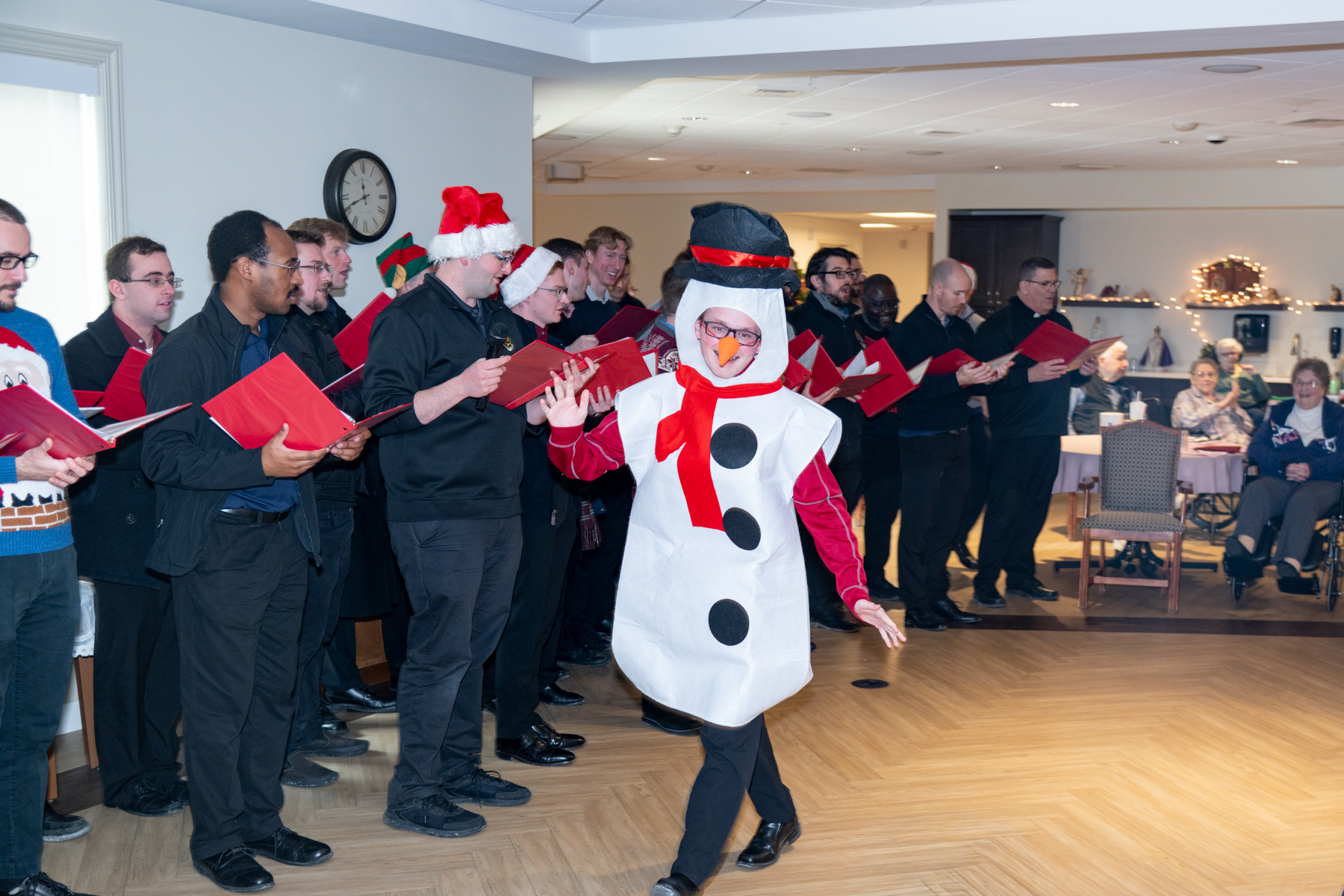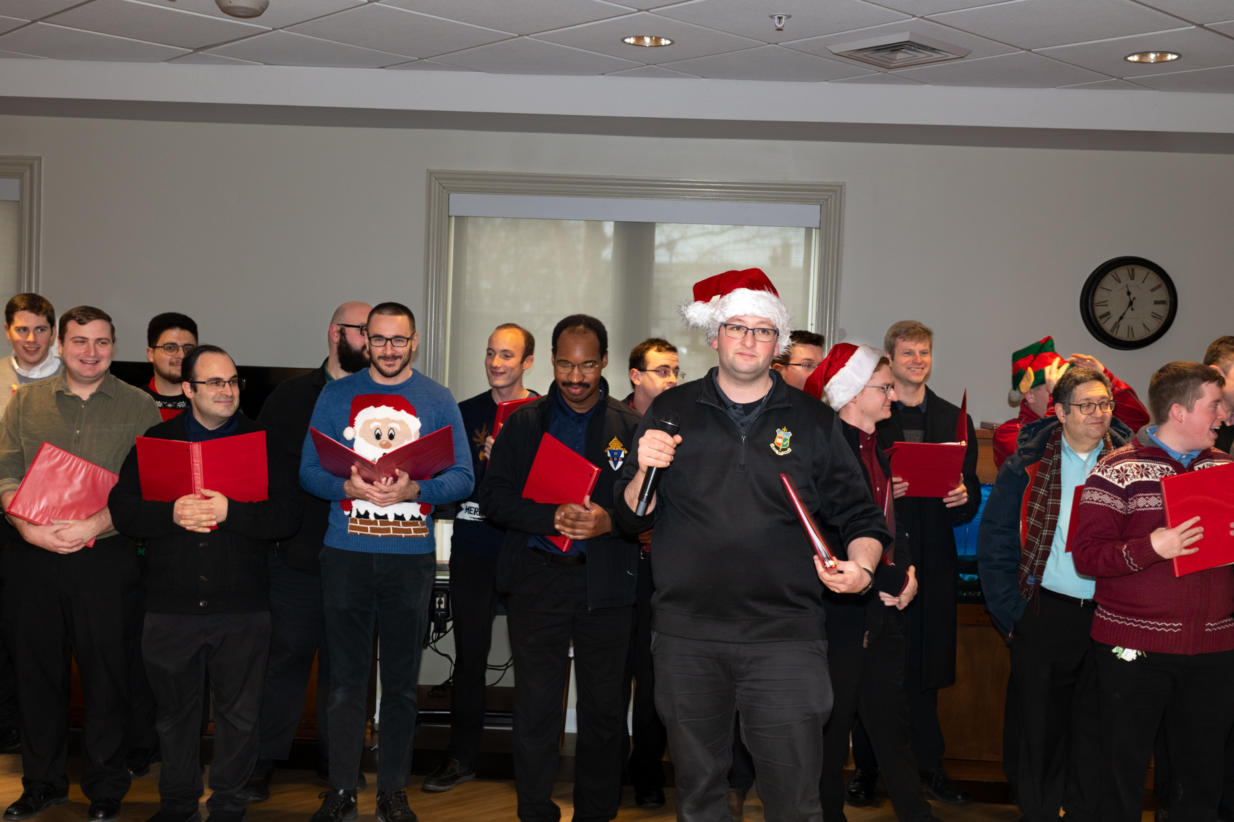 They conquered – With harmony of voice and manner, the seminarians, “Conquered” the hearts of their audience. They achieved the active participation of all, inspiring us to sing along with old favorite Christmas carols and making us laugh out loud at the antics of those dressed up like Santa, Elves, Elvis, a Polar Bear and Rider, Snowman, etc.