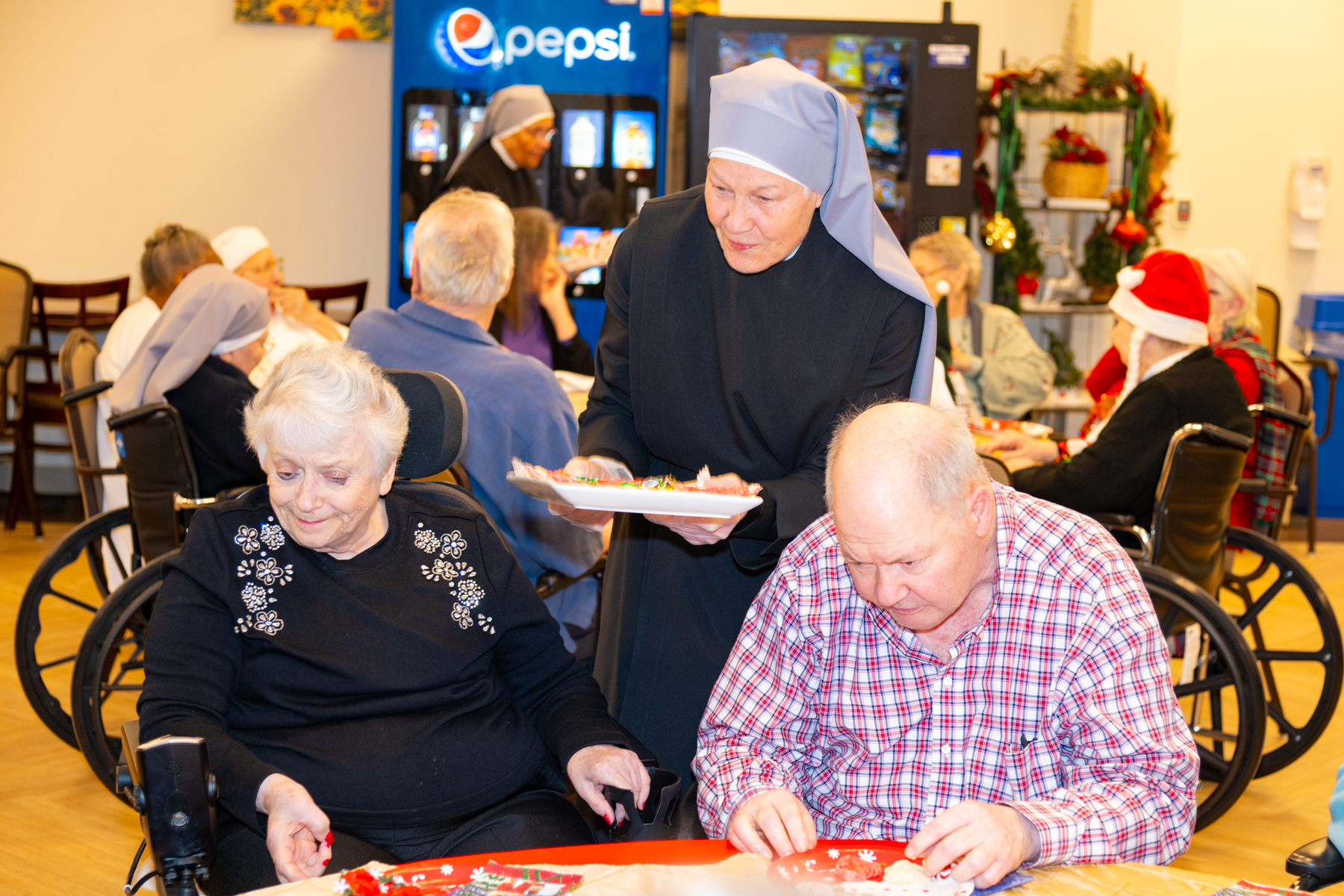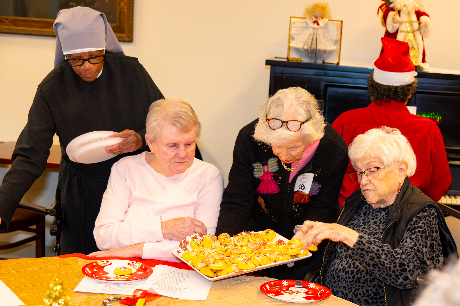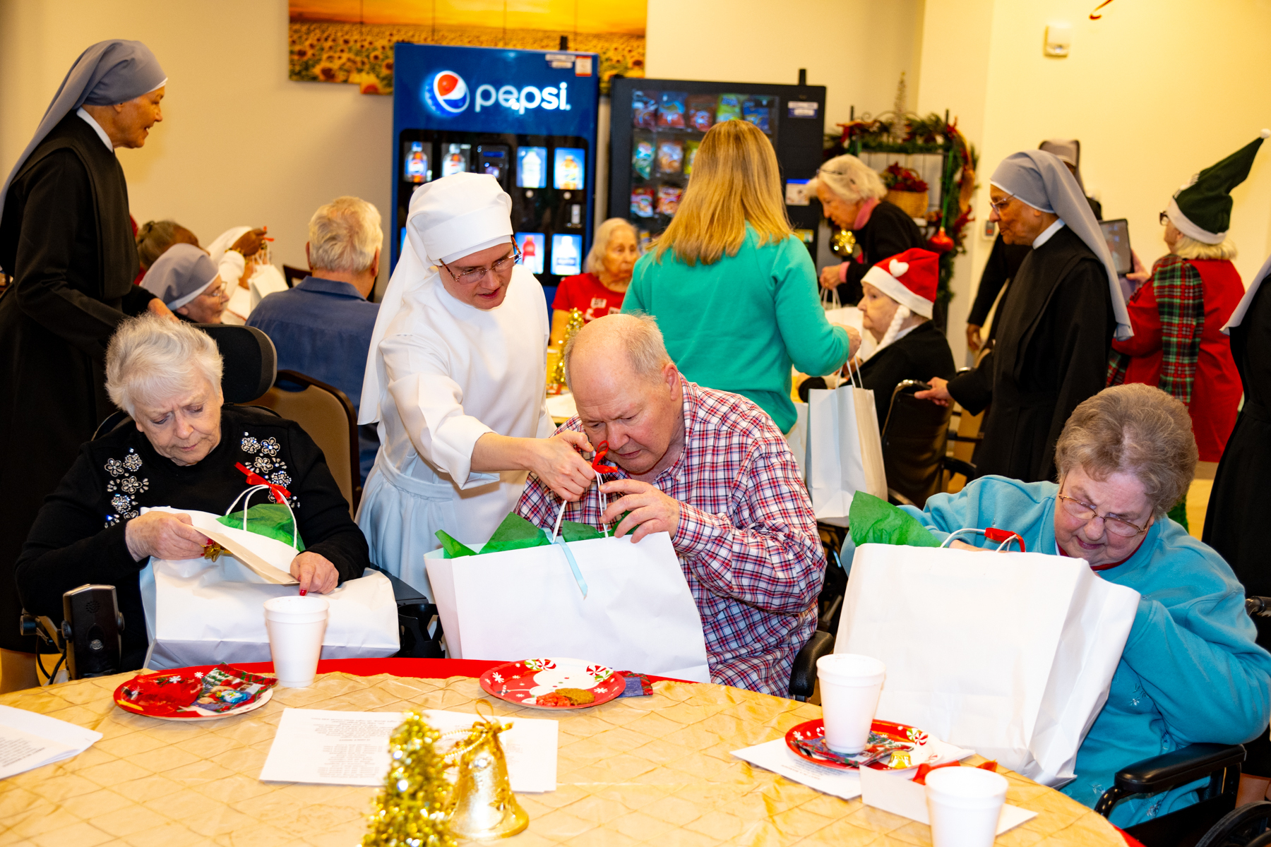 Then Mary Lou, a long-time Resident, added, “What grabs me is the delight the Little Sisters get from giving us the gifts. They seem so happy to come around to distribute, as a community, the lovely presents they begged for us!”