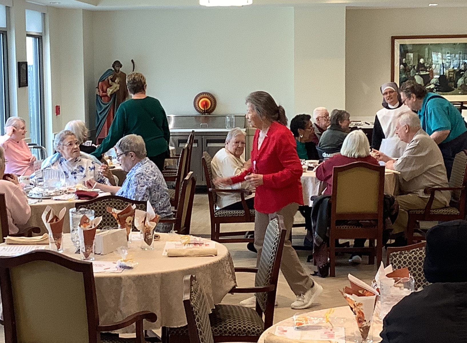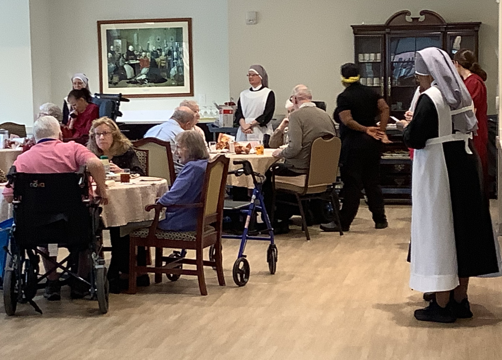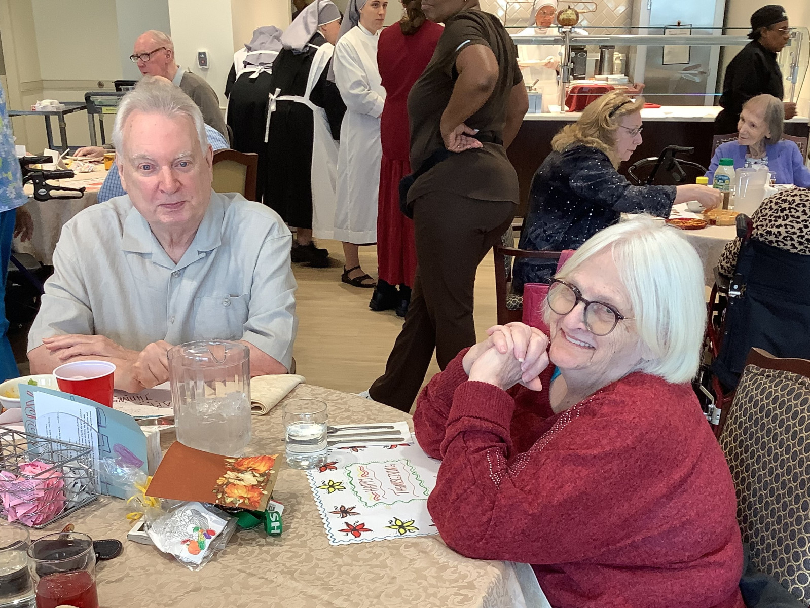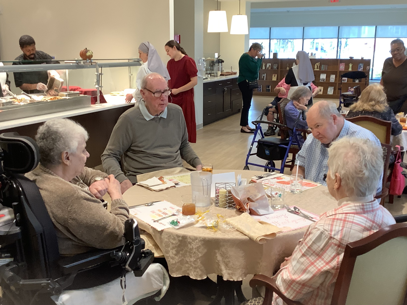 Thanksgiving Day 2025 was the first federal holiday dedicated to expressing gratitude to God in our recently renovated Home. We hope that we started a new holiday tradition by gathering in the apartment dining room, for our festive meal, all our Residents from both St Joseph’s Care Unit and the Apartments. Residents, old-timers and new comers, agreed that it was “good to be together.” Little Sisters and Staff were happy with this arrangement as well. It enhanced the family spirit.