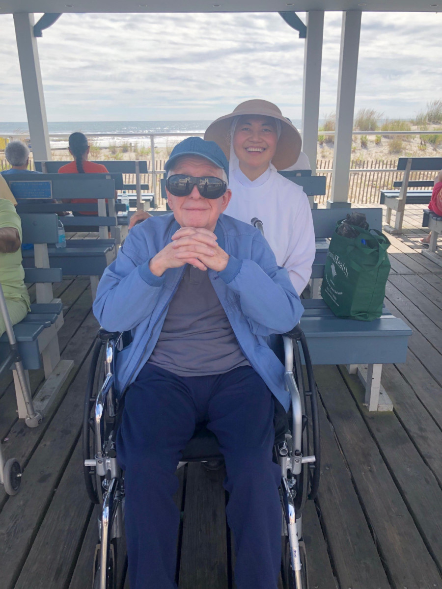 The Season of Creation 2024 was celebrated “down the shore.” On September 19, the Jeanne Jugan Associates sponsored a trip to Ocean City, NJ for Residents of St. Joseph’s Care Unit who would not otherwise have had the chance to spend a beautiful day at the shore. The thought of fresh salty air and vast horizons had early birds and night owls alike waking up with extra energy. Most began the day with 7 a.m. Mass offered by our chaplain, Fr. Sullivan. With Associates, Little Sisters, staff and a volunteer driver along for the fun, each Resident had someone to help them.